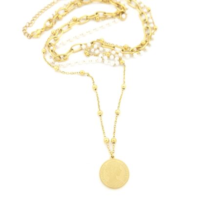 Ατσάλινο Γυναικείο Επιχρυσωμένο Κολιέ, Με Τριπλή Αλυσίδα, Πέρλες Και Λίρα Ανοξείδωτο ατσάλι Μήκος: 42cm(38+4cm extension) Εγγύηση Kirki Kosmima Guarantee 109035