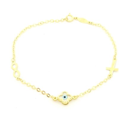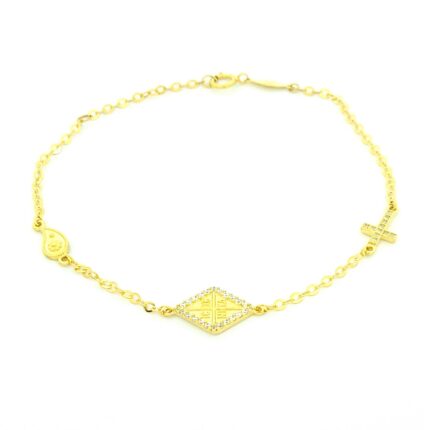 Χρυσό Παιδικό Βραχιόλι Διπλής Όψης Κ9, Με Κωνσταντινάτο Με Ζιργκόν, Με Αναπαράσταση των Αγίων Κωνσταντίνου και Ελένης, Με Σταυρουδάκι Και Σταγόνα