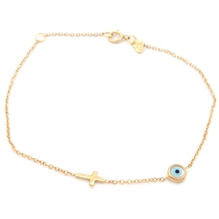 Ροζ Χρυσό Γυναικείο Βραχιόλι Κ9, Με Ματάκι και Σταυρό Κ9 Βάρος: 0,6 γραμμάρια Μήκος: 18cm (16 + 2cm) Εγγύηση Kirki Kosmima Guarantee