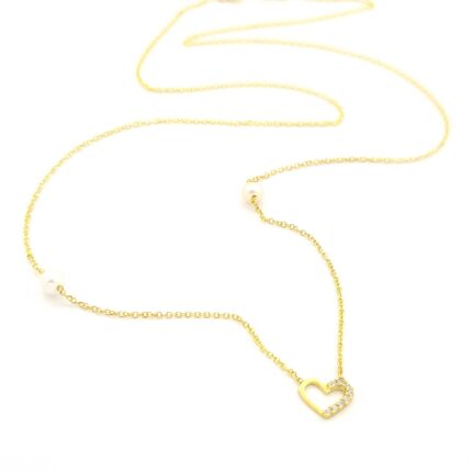 Χρυσό Γυναικείο Κολιέ Κ14, Με Καρδιά, Μαργαριτάρια Και Λευκά Ζιργκόν κωδ.108562