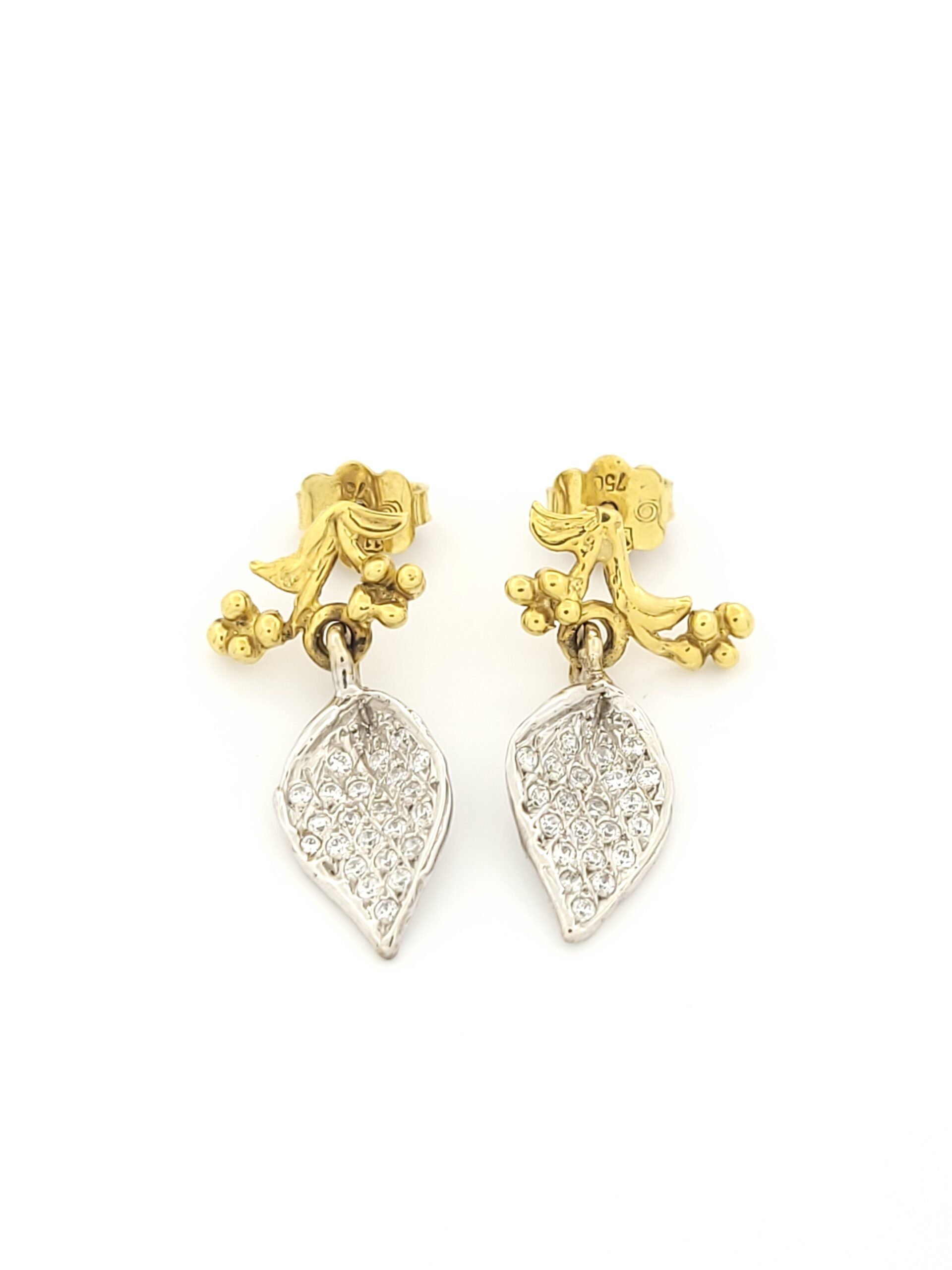 Χρυσά Χειροποίητα Δίχρωμα Γυναικεία Σκουλαρίκια Κρεμαστά Κ18, Με Φύλλα Με Ζιργκόν κωδ.106803