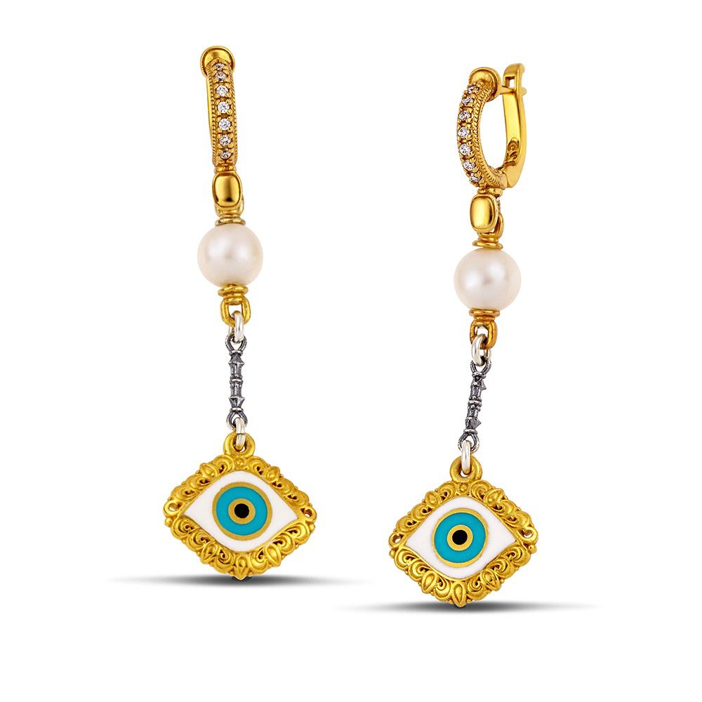 Ασημένια Δίχρωμα Σκουλαρίκια Κρεμαστά Dimitrios-Exclusive, Μάτι Με Σμάλτο, Μαργαριτάρι Και Λευκά Ζιργκόν κωδ.S197-1