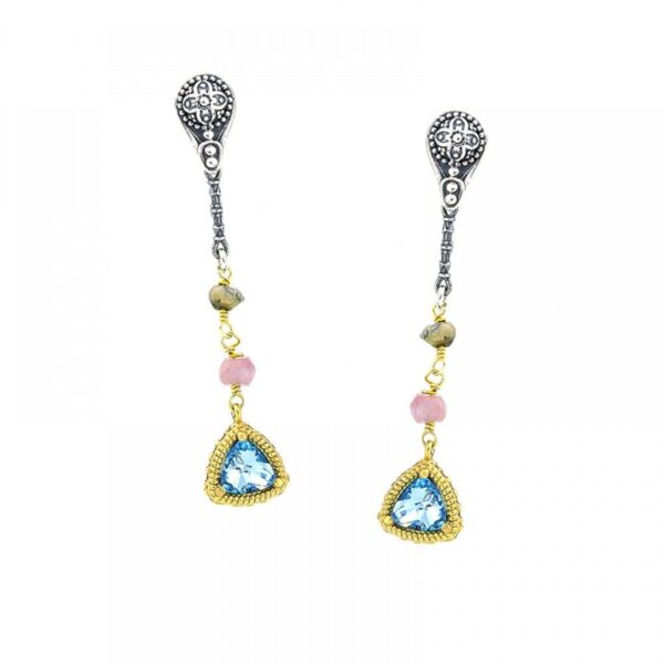 Ασημένια Δίχρωμα Σκουλαρίκια Κρεμαστά Dimitrios-Exclusive, Με Γαλάζιο Swarovski Και Πολύχρωμο Ροζάριο κωδ.S135