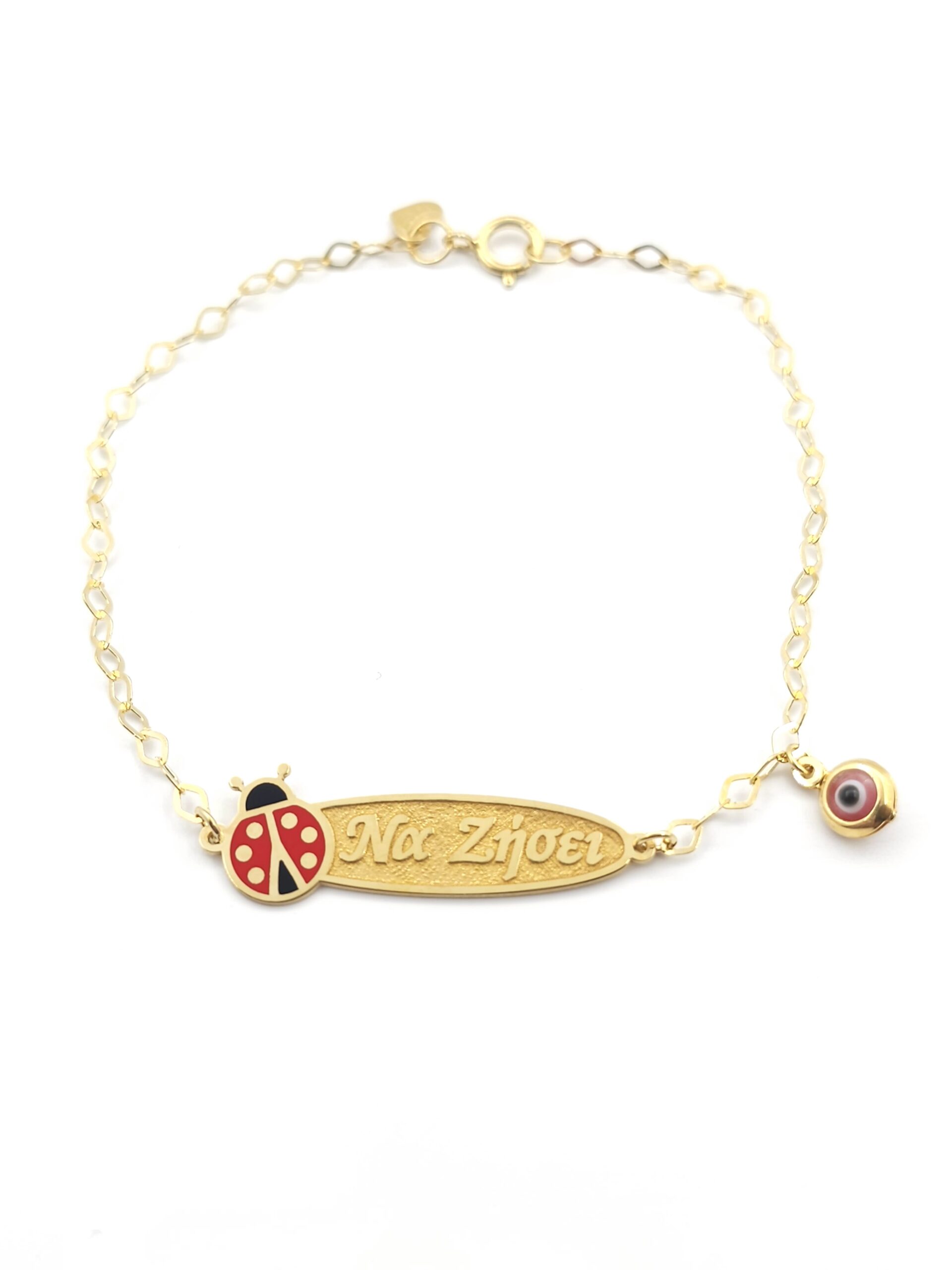 Ασημένιο Επιχρυσωμένο Παιδικό Βραχιόλι-Ταυτότητα “Να Ζήσει”, Με Πασχαλίτσα Και Κόκκινο Ματάκι κωδ.105701