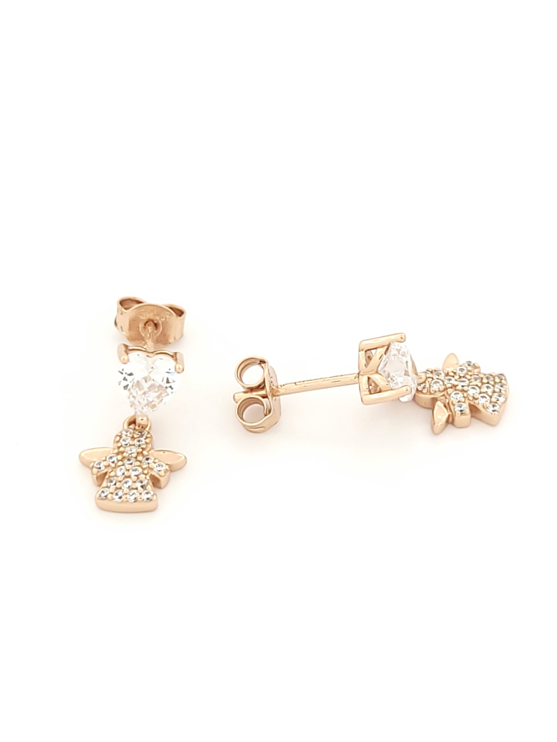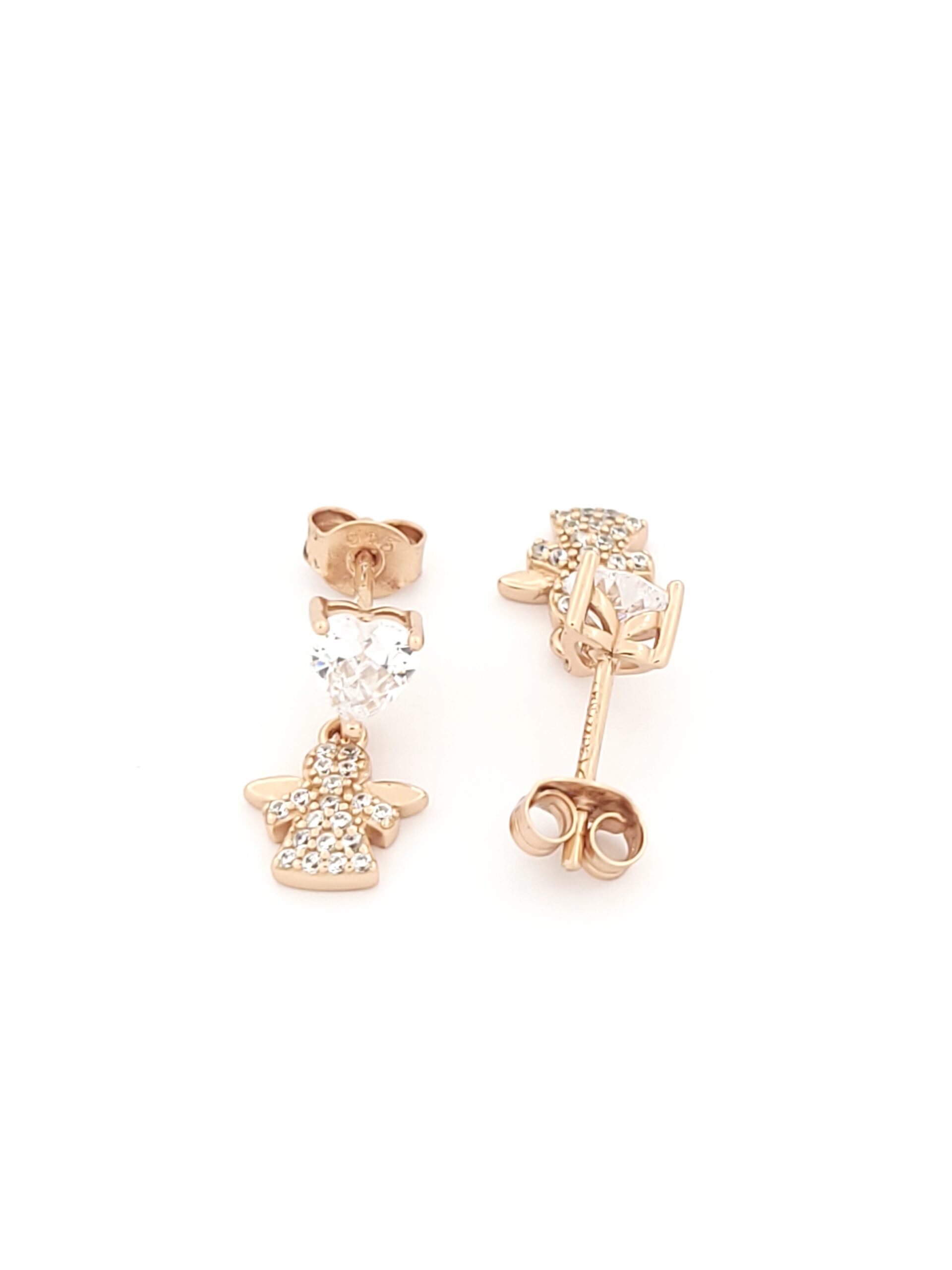 Ασημένια Ροζ Gold Γυναικεία Σκουλαρίκια Καρφωτά, Με Αγγέλους Και Καρδιές Με Ζιργκόν