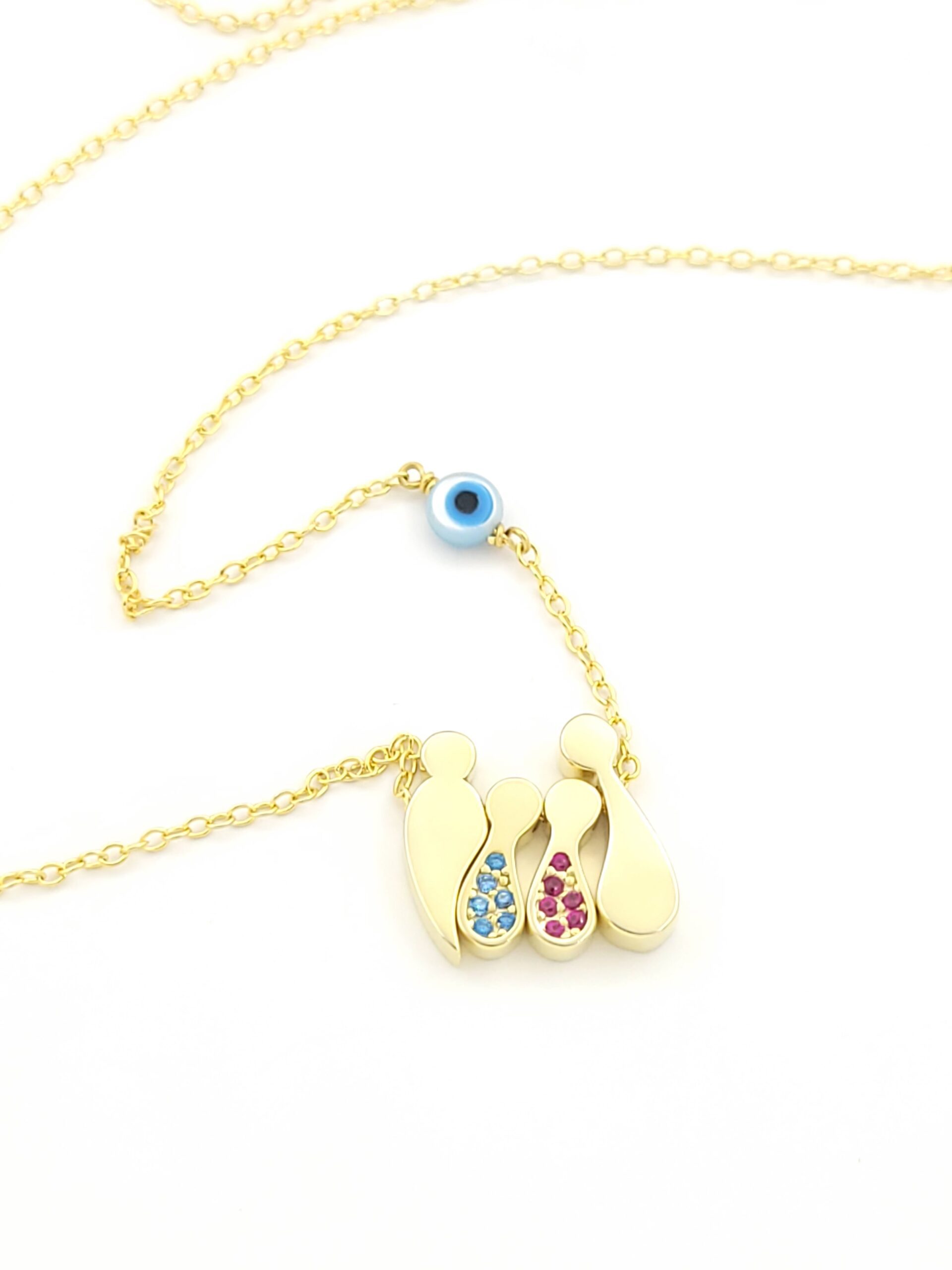 Ασημένιο Επιχρυσωμένο Γυναικείο Κολιέ, Με Τετραμελή Οικογένεια Με Αγοράκι, Κοριτσάκι, Χρωματιστά Ζιργκόν Και Ματάκι κωδ.108575