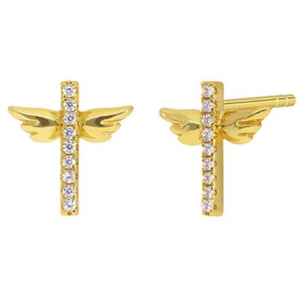 Ασημένια Επιχρυσωμένα Γυναικεία Σκουλαρίκια Καρφωτά ,Σταυρός Με Φτερά Και Λευκά Ζιργκόν κωδ.D03301/AW