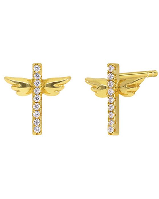 Ασημένια Επιχρυσωμένα Γυναικεία Σκουλαρίκια Καρφωτά ,Σταυρός Με Φτερά Και Λευκά Ζιργκόν κωδ.D03301/AW