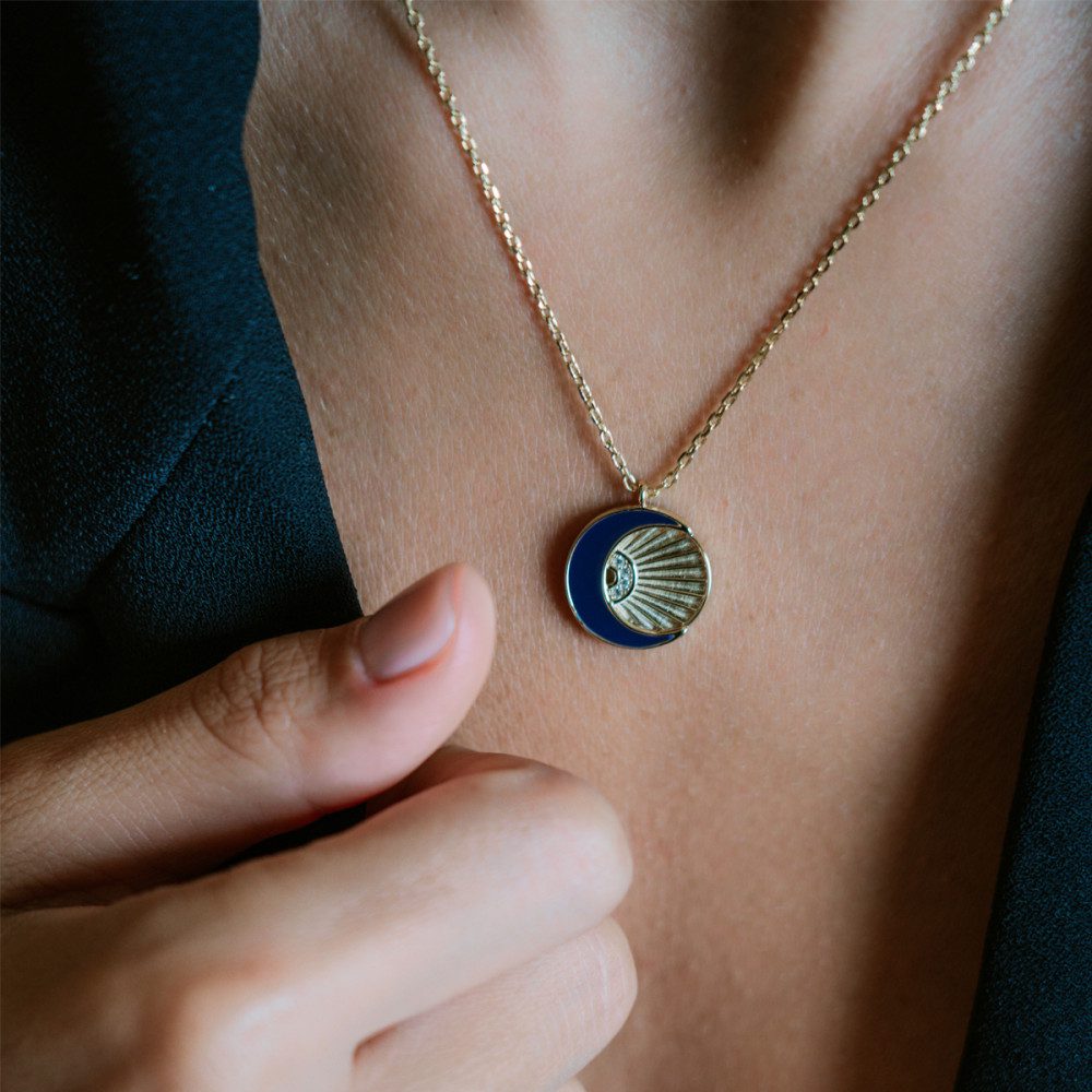 Ασημένιο Επιχρυσωμένο Γυναικείο Κρεμαστό JCou Sun & Moon με Σμάλτο και Άσπρα Ζιργκόν
