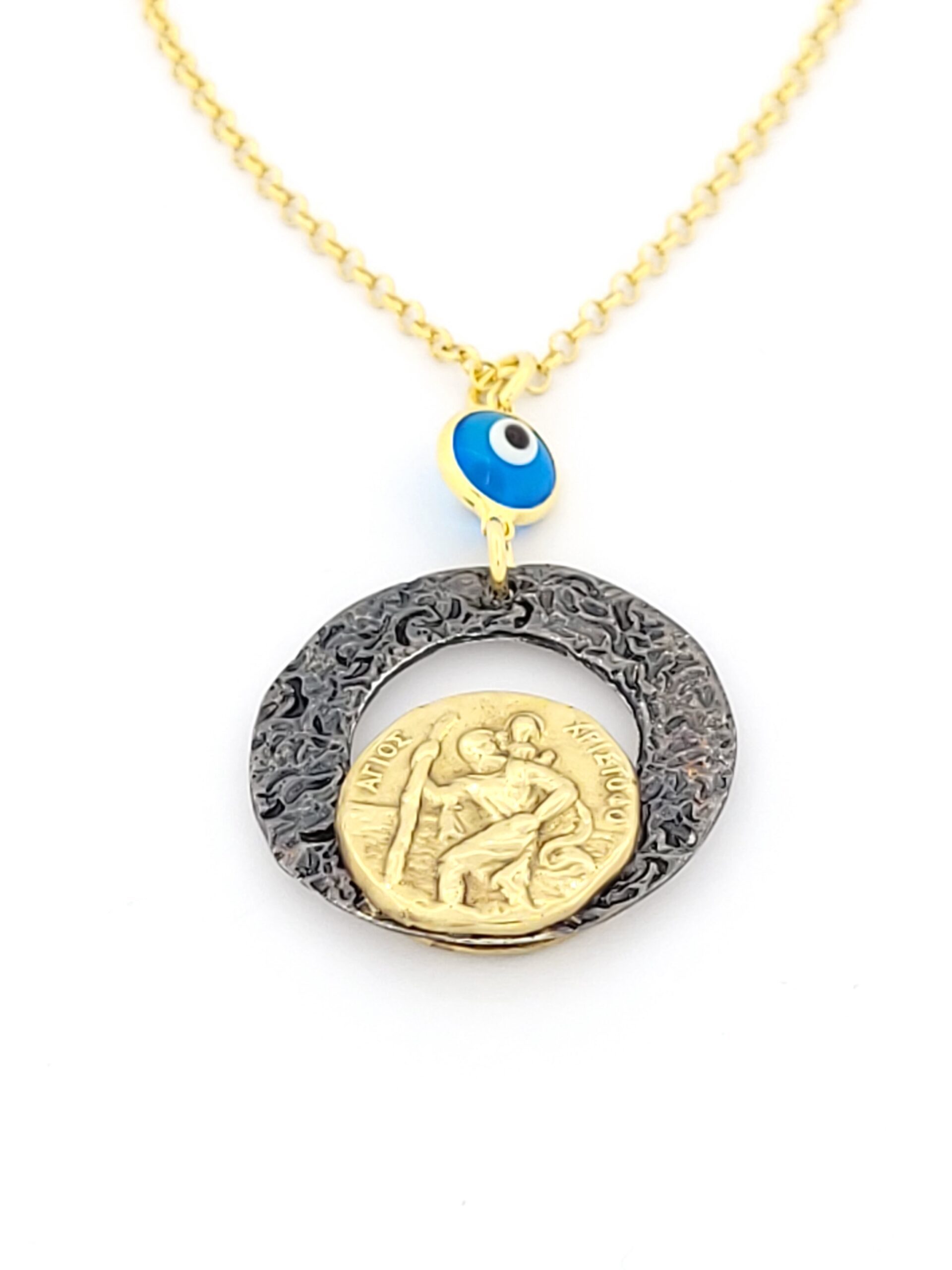 Ασημένιο Δίχρωμο Γούρι Με Ματάκι, Παναγίτσα Και Αναπαράσταση Του Άγιου Χριστοφόρου κωδ.109633