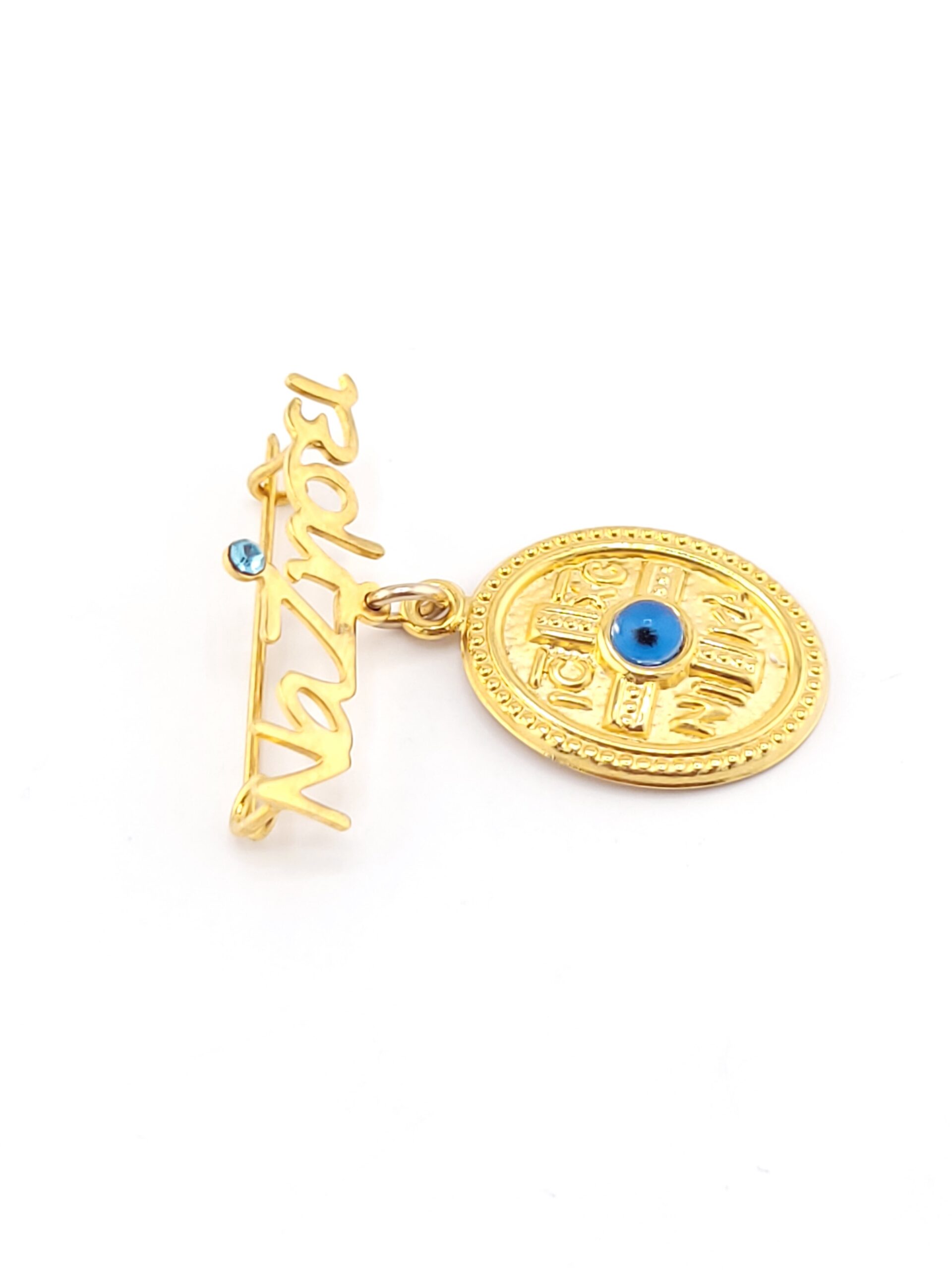Χρυσή Παιδική Παραμάνα “Να Ζήσει” Κ9, Με Μπλε Ζιργκόν Και Κωνσταντινάτο Με Ματάκι κωδ.105398