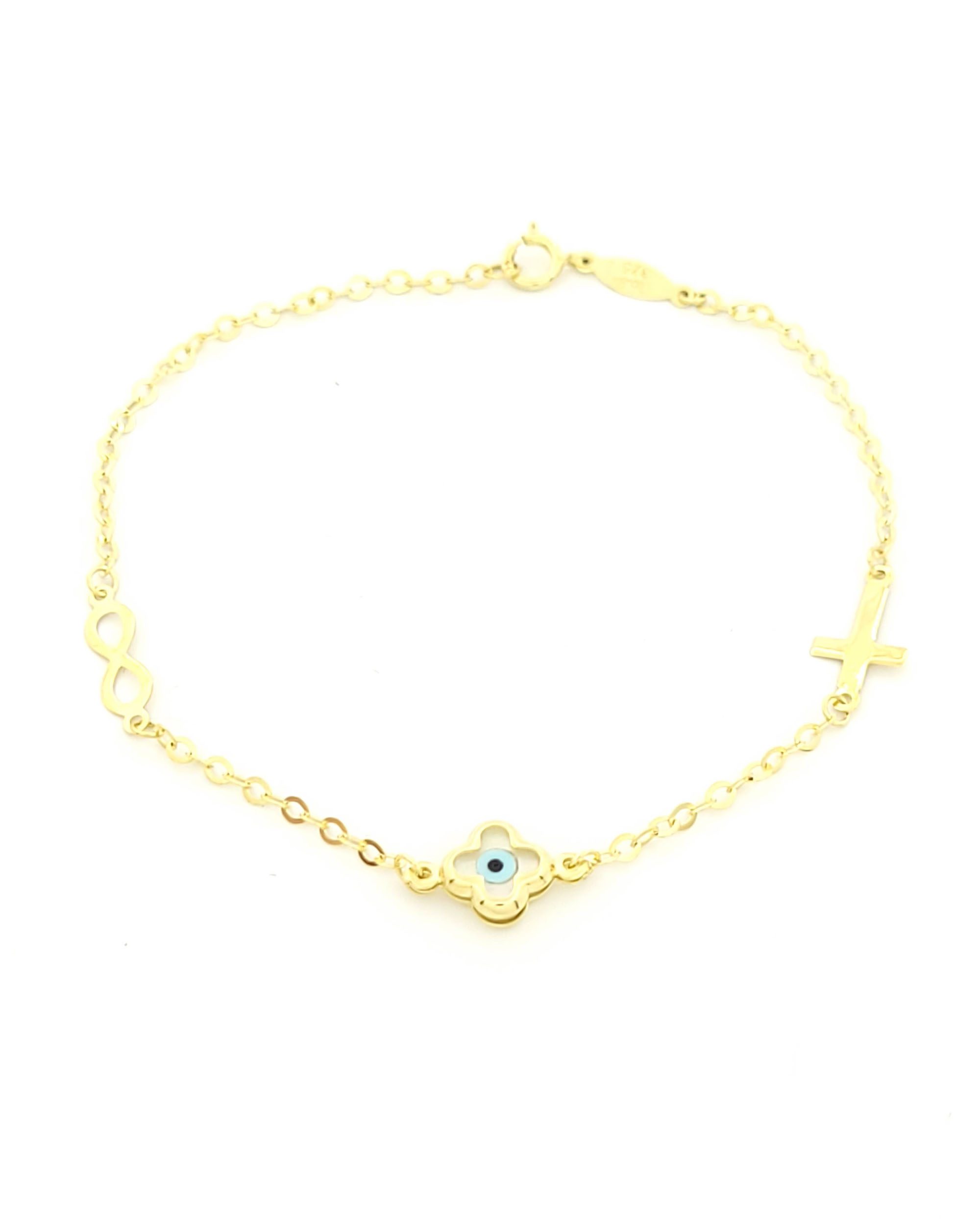 Χρυσό Παιδικό Βραχιόλι Κ9,Με Σταυρουδάκι, Άπειρο Και Ματάκι Σταυρουδάκι
