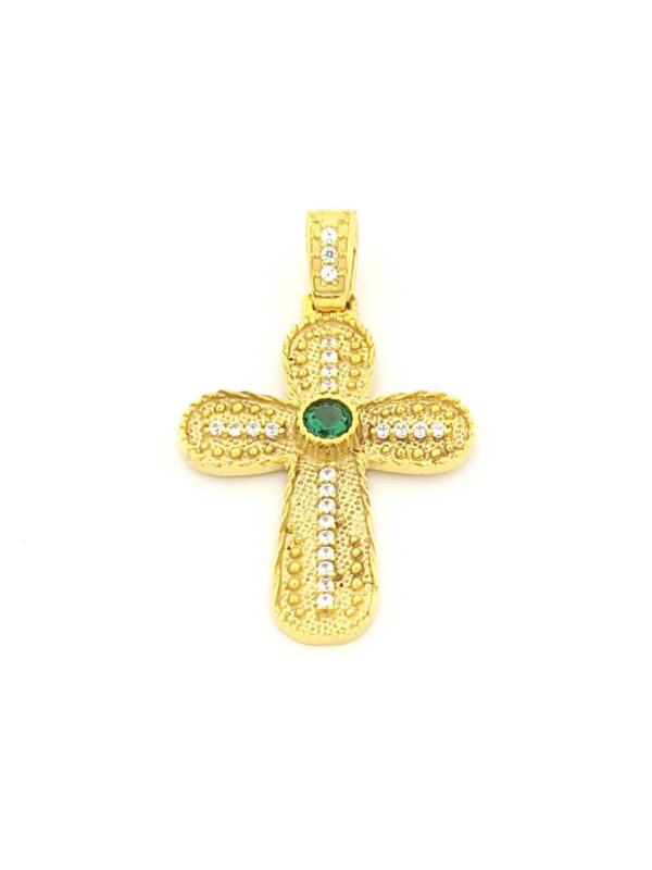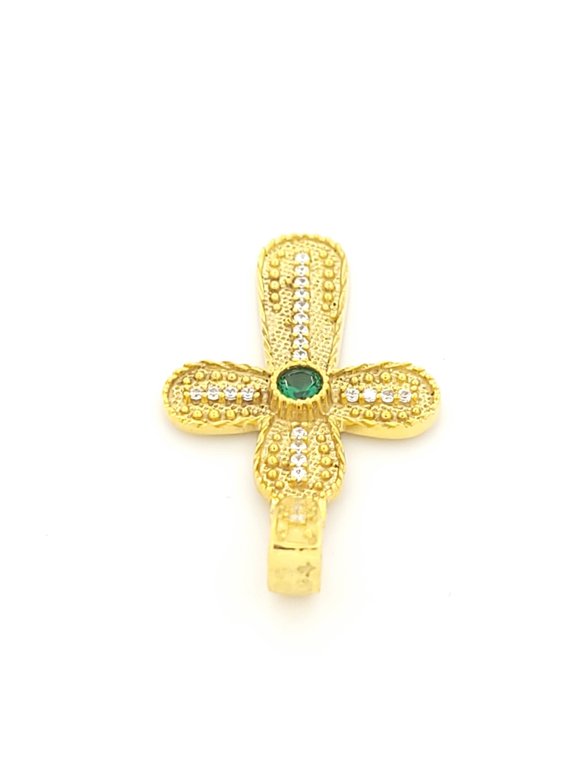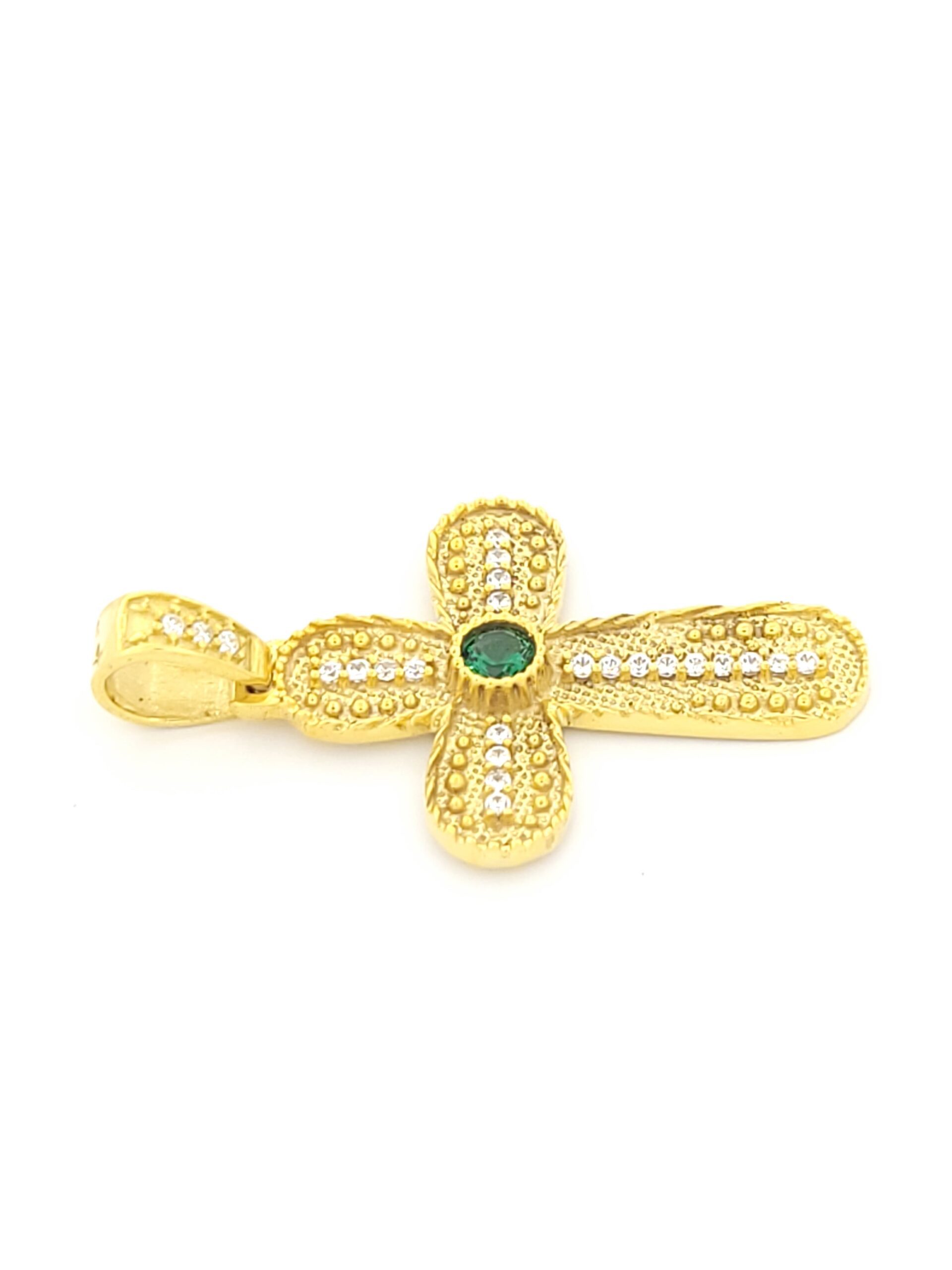 Χρυσός Βυζαντινός Γυναικείος Σταυρός Κ14, Με Πράσινο Και Λευκά Ζιργκόν κωδ.106084