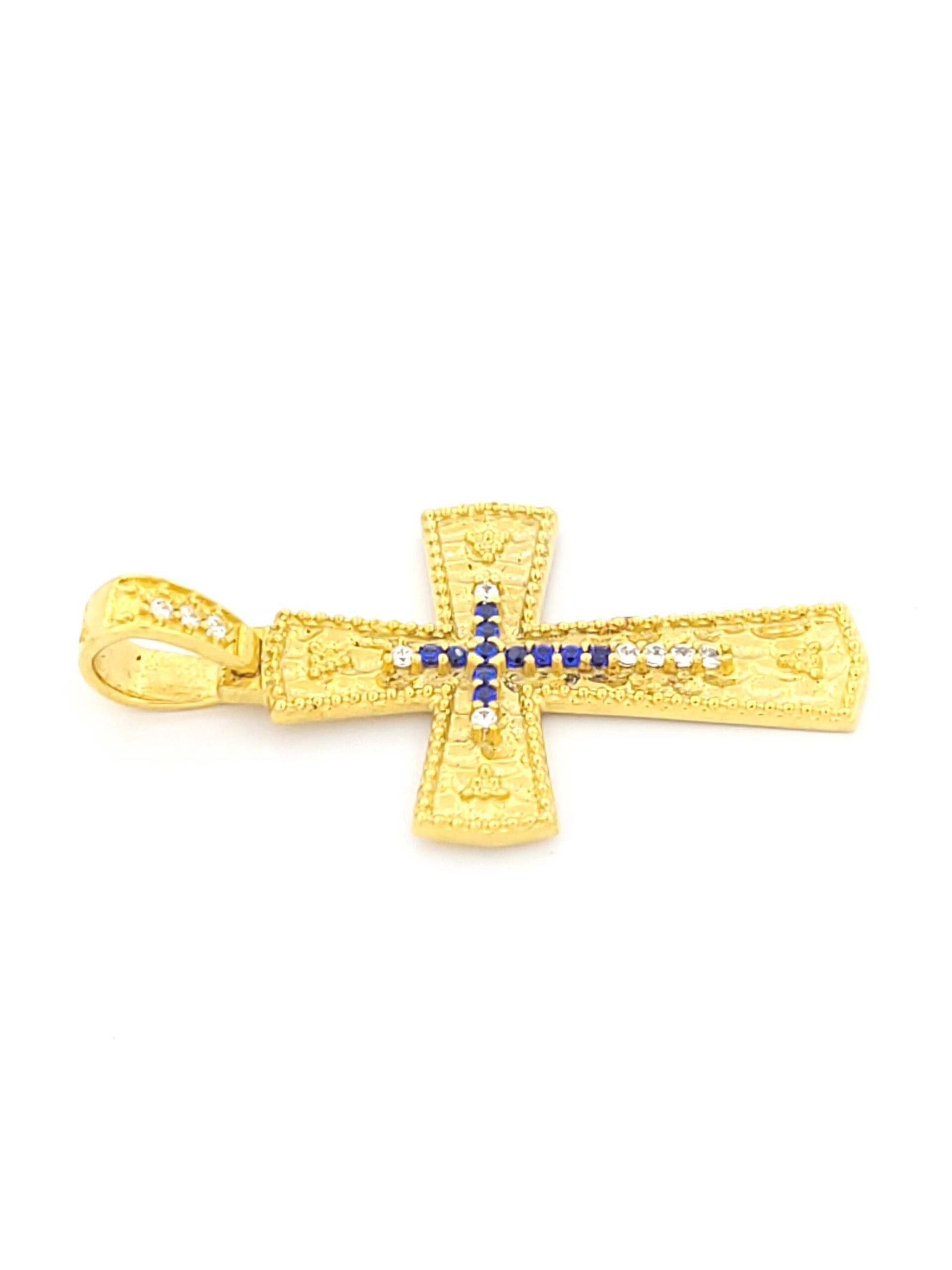 Χρυσός Βυζαντινός Γυναικείος Σταυρός Κ14, Με Μπλε Και Λευκά Ζιργκόν κωδ.106085