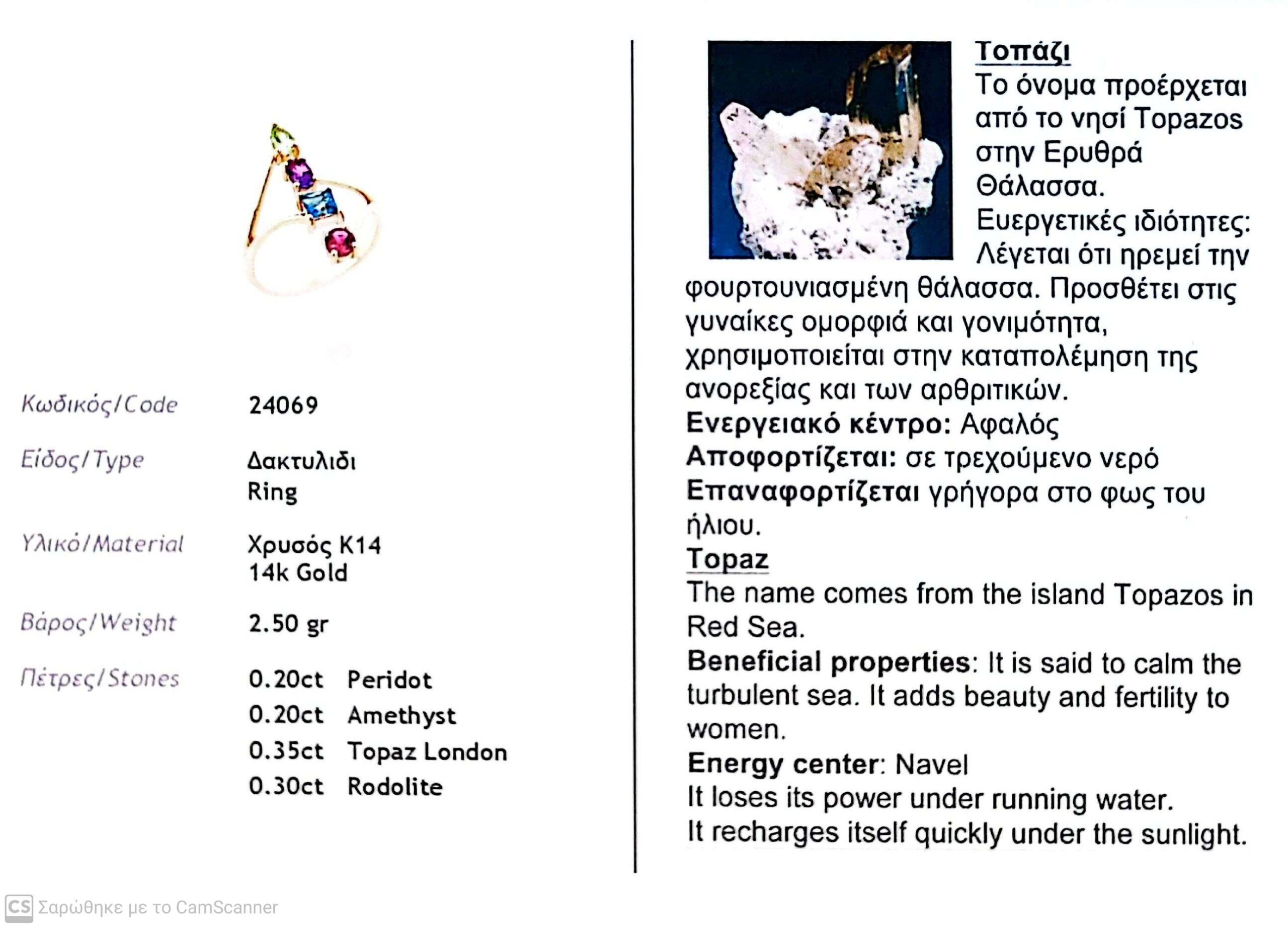 Γυναικείο Χρυσό Δαχτυλίδι Κ14 Της MetronGold, Με Περίδοτο, Αμέθυστο , Ροδολίτη Και London Blue Τοπάζι κωδ.24069