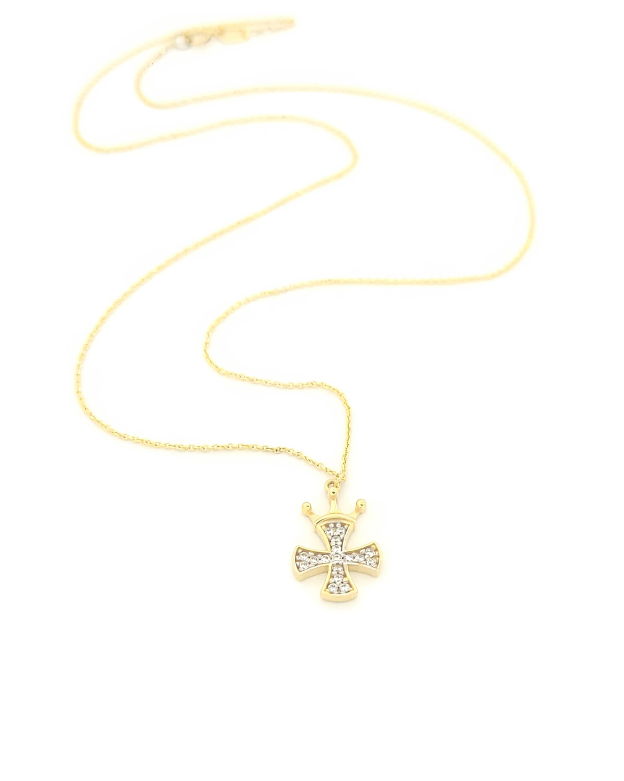 Γυναικείο Χρυσό Κολιέ Κ14, Με Σταυρό και Κορόνα Με Λευκά Ζιργκόν