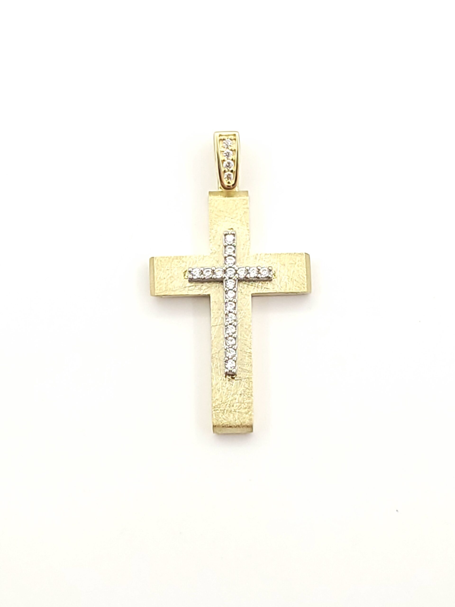 Xρυσός Γυναικείος Σταυρός Διπλής Οψης Κ14, Mατ Με Λευκά Ζιργκόν κωδ.107389