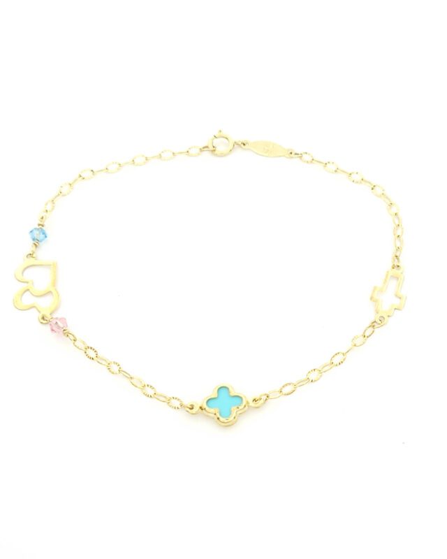 Χρυσό Παιδικό Βραχιόλι Κ9, Με Γαλάζιο Σταυρουδάκι, Με Ροζ Και Γαλάζια Στοιχεία, Με Καρδιές Και Σταυρουδάκι κωδ.109217