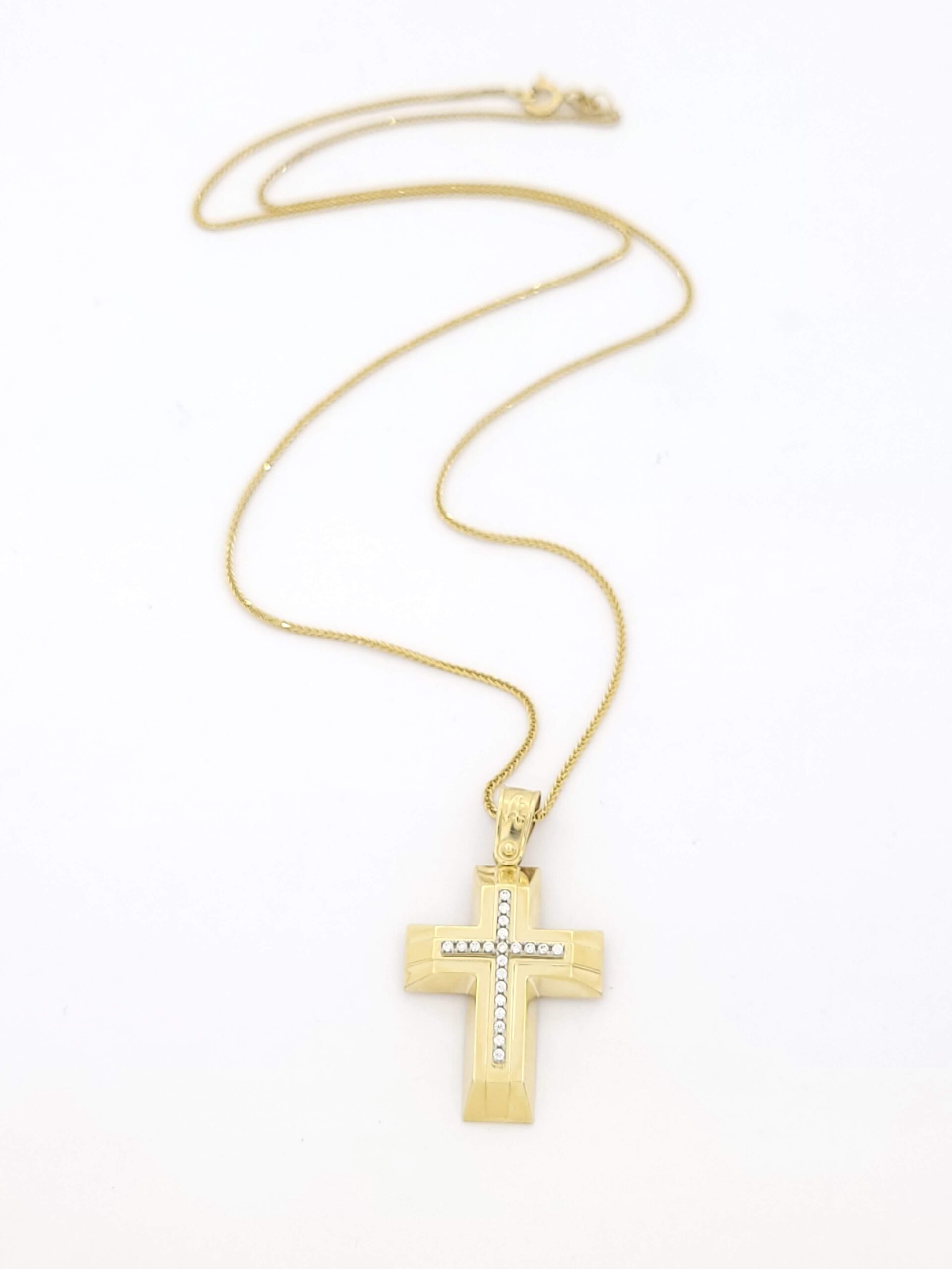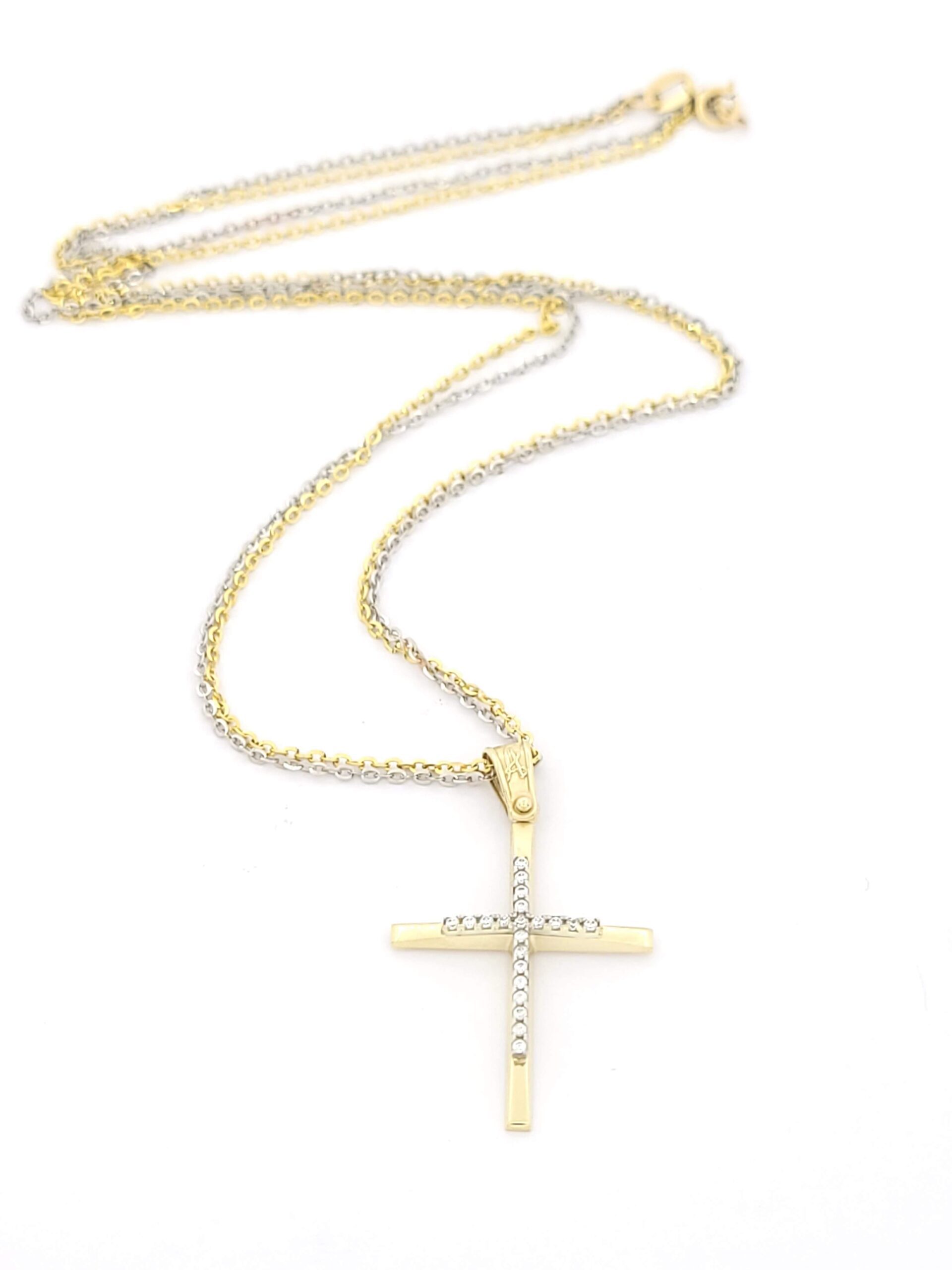 Χρυσός Γυναικείος Δίχρωμος Σταυρός Anorado K14 με Ζιργκόν, με Διπλή Δίχρωμη Αλυσίδα κωδ.101148